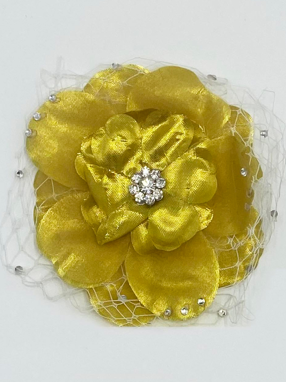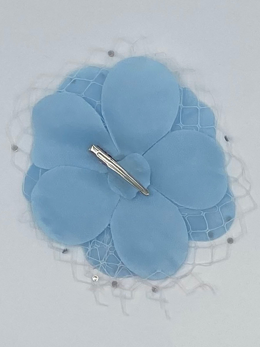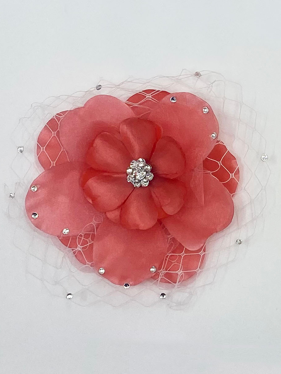 Flower hair clips with rhinestone center and white fishnet accents