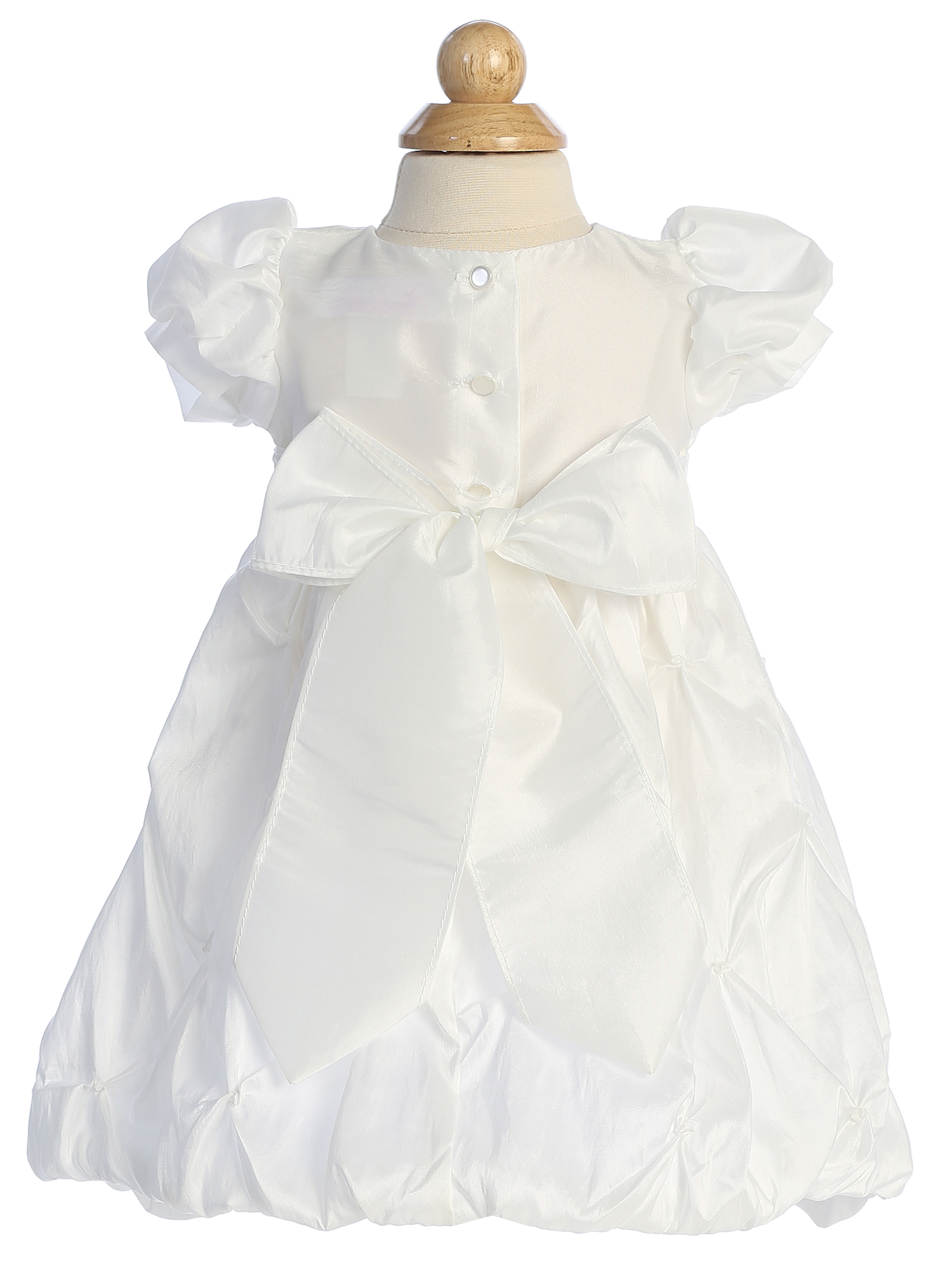 Puff cap sleeves and organza bow at waist and bonnet